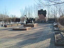 Ұлы Отан Соғысы жылдарында қаза тапқан жауынгерлерге арналған мемориал, Сәл қисайтыла орналасқан тік бұрышты стилобатта орнатылған ескерткіште орталық-өзектік композиция бар. Оның геометриялық орталықтан жоғары орналасқан орталық өзегінде мәңгі алаудың бес тармақты жұлдызы орналасқан. Ансамбль алдыңғы жағынан Ұлы отан соғысы басталған және аяқталған күндер жазылған тік бұрышты екі тұғырмен көмкерілген. |